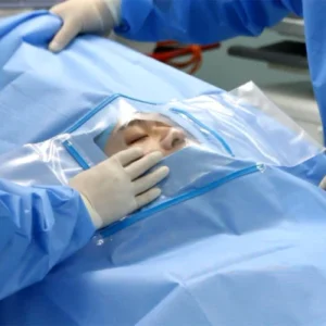 High-quality Eye Drape designed for ophthalmic surgeries like cataract, phaco, and trabeculectomy. Made from low-lint, sterile fabric with adhesive fenestration and fluid collection pouch. Provides maximum protection, infection control, and comfort for both patients and surgeons. Manufactured and supplied by Prakhar Medics, India.